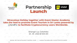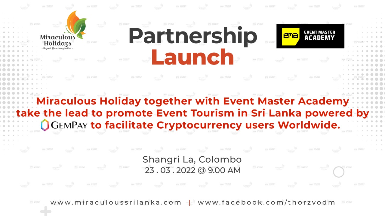 GemVault Fintech (Pvt) Ltd, GemPay provides the payment gateway solutions for bitcoin and other cryptocurrency users worldwide for holiday experiences in Sri Lanka. Miraculous Holidays and GemPay signed their business cooperation and partnership agreement to work together on 17th March 2022 at Shangri-La, Colombo where Miraculous Holidays became the first-ever Sri Lankan travel company to accept Bitcoin and other cryptocurrencies by partnering with GemPay. Miraculous Holidays and Thorz of Event Master Academy also signed their business cooperation and partnership agreement to work together on 23th March 2022 at Shangri-La, Colombo and became the official travel partners of Road to EMF and thereby took the lead to promote event tourism in Sri Lanka powered by GemPay to facilitate cryptocurrency users worldwide.