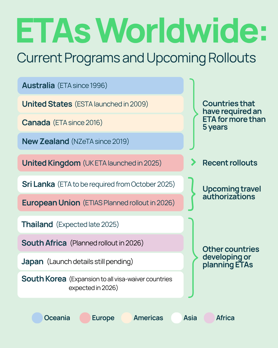 - Korea: K-ETA launched in 2021. It is still not mandatory for all visa-exempt travelers, but there are plans to extend it to all by 2026.
